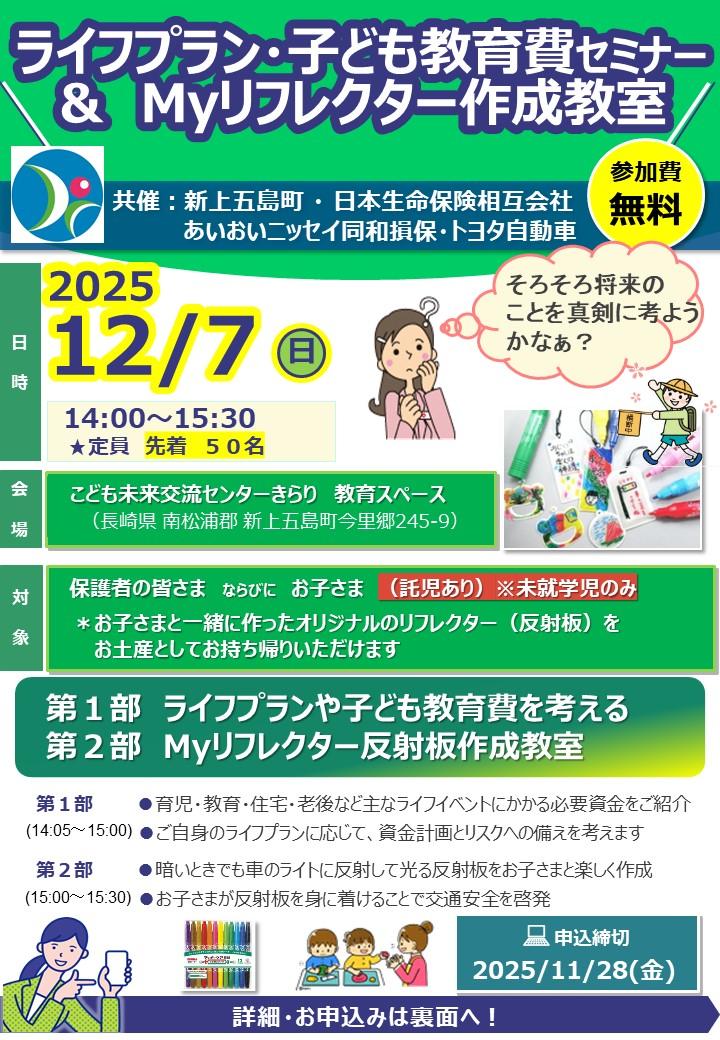 令和7年12月7日(日)こども未来交流センターきらりにおいて、「子ども教育費セミナー・Myリフレクター作成教室」を開催します。
